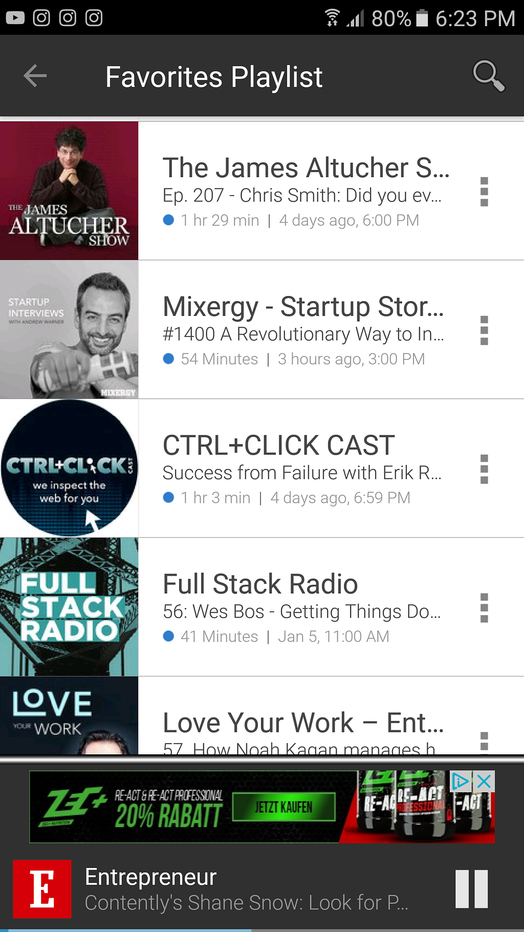 Podcasts son otra opción altamente recomendada. Muchas veces los autores de libros producen o participan en muchos podcasts. Un podcast puede ser como una condensación de un libro. El autor explica la tesis central del libro y además uno puede aprender desde un ángulo diferente sobre el conocimiento del autor. Mi aplicación favorita de podcasts es Stitcher.