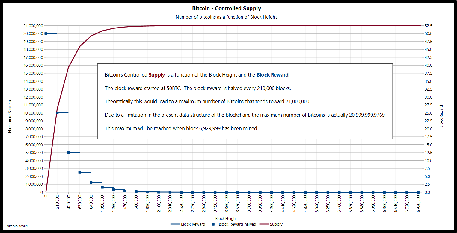 Hay varias teorías sobre lo que causa inflación pero lo más común parece ser inflación de moneda. Cuando entra más dinero en un sistema de lo que se require, su valor disminuye. Es la ley básica de economía, suministro y demanda. Cada país normalmente tiene una institución encargada de regular el suministro de dinero a la economía. Pero que pasaría si ese mecanismo consistiría en una formula matemática? Bienvenidos al mundo de las monedas digitales! Bitcoin tiene un algoritmo especial encargado de regular la dificultad de mineo de la moneda. Se le denomina controlled supply (suministro controlado). El algoritmo consiste en una fórmula que reduce la recompensa para minear un 50% cada 210,000 bloques. Para aprender más detalles leer este post.