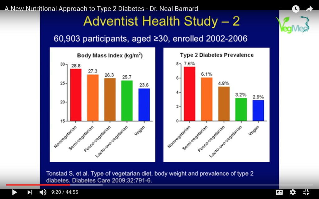 Uno de los estudios de más alta calidad realizados fue el Adventist-2 study. El estudio encontró que los casos de diabetes disminuían gradualmente mientras más grande el porcentaje de de alimentos de origen vegetal contenía la dieta. Las personas que se alimentaban estrictamente a base de plantas tenían 78% menos prevalencia de diabetes. [3]