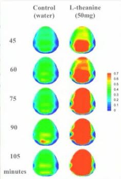 Today I felt very good in the morning, not that I usually don’t, but it may have something to do with this plant, Camellia sinensis. All the most consumed teas — white, green, oolong, and black — come from the leaves of the same plant, Camilla sinensis. We will focus on green tea because it is the least processed tea made with camilla sinensis. As Dr. Greger points out in one of his older videos, the world is obsessed with the tea plant. It is the most consumed beverage on earth. But there are hundreds of thousands of plants on earth, why are we drinking this particular one? It’s probably not the taste, it turns out it might be how this plant influences our brain. We have evidence from EEG’s (brain imaging) that our brain starts to resemble a high state of alpha, a state like that of experienced meditators. The alpha state is when we are fully alert and focused, but calm. It is the state we want to be in, or I do at least. In the image below we see a little yellow-reddish color on the control side after 90 minutes of relaxation from a non-meditator person. Now try to spot the difference to the person on the right after two cups of tea.