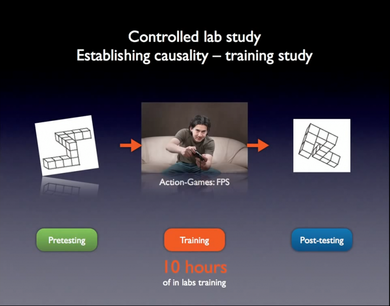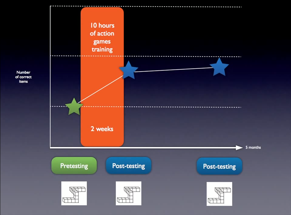 - Gamers are much better at an exercise called mental rotation after only 2 weeks and 10 hours of action games training. And this improvement is still there 5 months after having done the training.