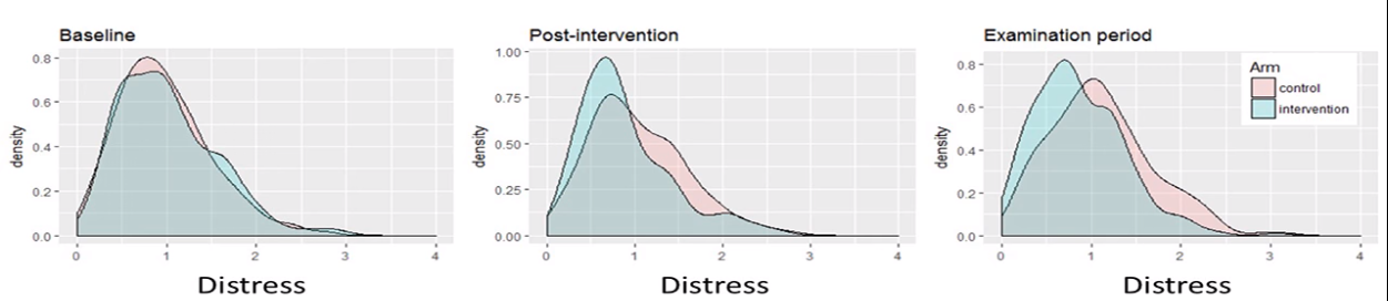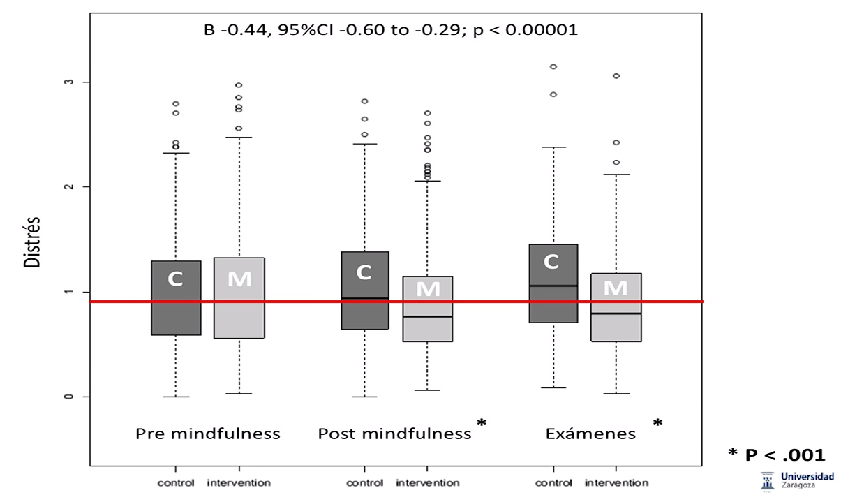 La línea mediana al comienzo es igual en el grupo de control (C) y Mindfulness (M), se debe a la aleatorización. Luego del estudio vemos que el grupo M tiene un nivel de distrés más bajo qu el grupo de control. Otra forma de visualizar a los resultados: