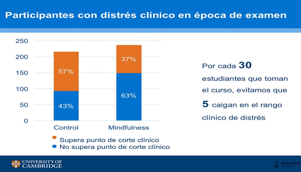 En el gráfico de arriba se ve que lamentablemente, la mayoría de los estudiantes de Cambridge caen en el rango clínico de distrés psicológico en época de exámen. En el grupo de mindfulness sigue habiendo un 37% pero el porcentaje ya es menor. Otra forma de decirlo es que por cada 30 alumnos que hacen el curso de mindfulness, evitamos que 5 caígan en el rango clínico de distrés.