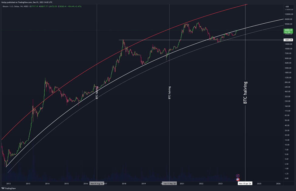 Para eso trazamos un líneas de trend sobre el gráfico en la escala logarítmica. Un gráfico logarítmico es nada más que un método de visualizar al precio a largo plazo. Permite visualizar a los trends de forma más fácil. Aquí un ejemplo: