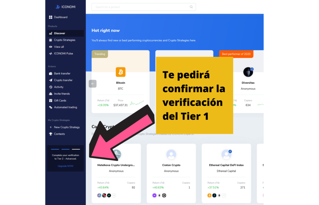 En Iconomi debes abrir una cuenta y subir una factura con dirección para verificar tu identidad. Sin verificarte no puedes subir fondos a la plataforma, es por la prevención del lavado de dinero.