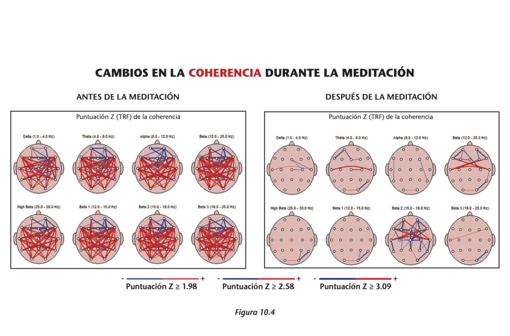 La primera imagen del esquema 10.4 representa a la actividad de un participante del seminario del autor. Se ve que el cerebro está en un estado demasiado activo, hay demasiado “mind chatter”. Para entender mejor por qué eso está mal, podemos hacer una analogía de un salón grande con muchas personas hablando al mismo tiempo. Es más dificil que dos personas se comuniquen en un entorno con mucha interferencia. Se pueden entender únicamente si están cerca y hablan más fuerte de lo normal. Lo mismo pasa dentro del cerebro, está en un estado estresado, hipervigilante e incoherente. Las distintas partes están compitiendo por atención. La segunda imagen muestra al cerebro del participante después de una sola meditación. Se ve que el cerebro esta en un estado más coherente y balanceado. En la informática conocemos un concepto que se llama relación señal/ruido, se aplica muy bien aquí.