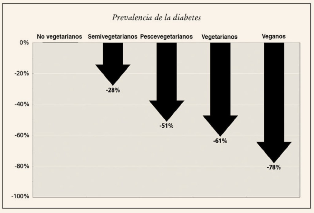 Esta diferencia podría explicar por qué las personas que se alimentan fundamentalmente con productos de origen vegetal están más protegidas de la diabetes. Los investigadores han comparado la resistencia a la insulina y el contenido en grasa de personas veganas y omnívoras. Como las personas veganas cuentan con la ventaja de ser, en promedio, mucho más delgadas, los investigadores reclutaron a omnívoros que pesaban lo mismo que los veganos a quienes estaban estudiando, con el objetivo de poder determinar si las dietas basadas en alimentos de origen vegetal ejercían un efecto directo más allá del indirecto de eliminar grasa de la musculatura gracias a la pérdida de peso.