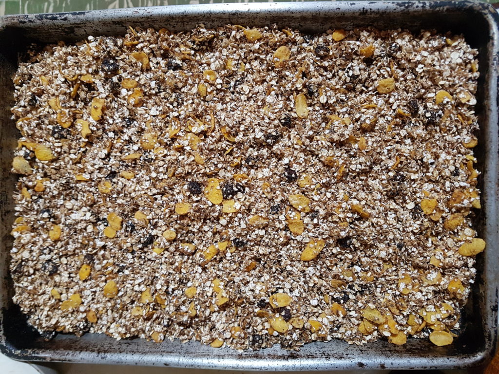 Luego poner todo en una bandeja y poner en el horno a fuego lento, aproximadamente 150 grados, por media hora. Es importante revolver después de 15 minutos para que se cocine mejor todo.