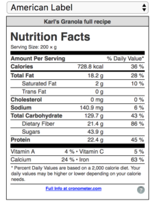 Contenido nutricional en una porción (200g) de Granola.